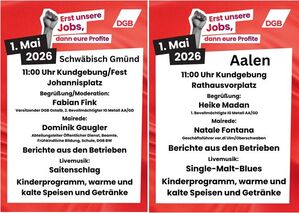 Die Kundgebungen am 1. Mai um 11.00 Uhr in Aalen (Rathausvorplatz) und Schwäbisch Gmünd (Johannisplatz) stehen in diesem Jahr unter dem Motto „Erst unsere Jobs, dann eure Profite“. Damit setzt der Gewerkschaftsbund ein deutliches Zeichen für gute Arbeit, sichere Beschäftigung und soziale Gerechtigkeit in Zeiten tiefgreifender wirtschaftlicher und gesellschaftlicher Veränderungen.